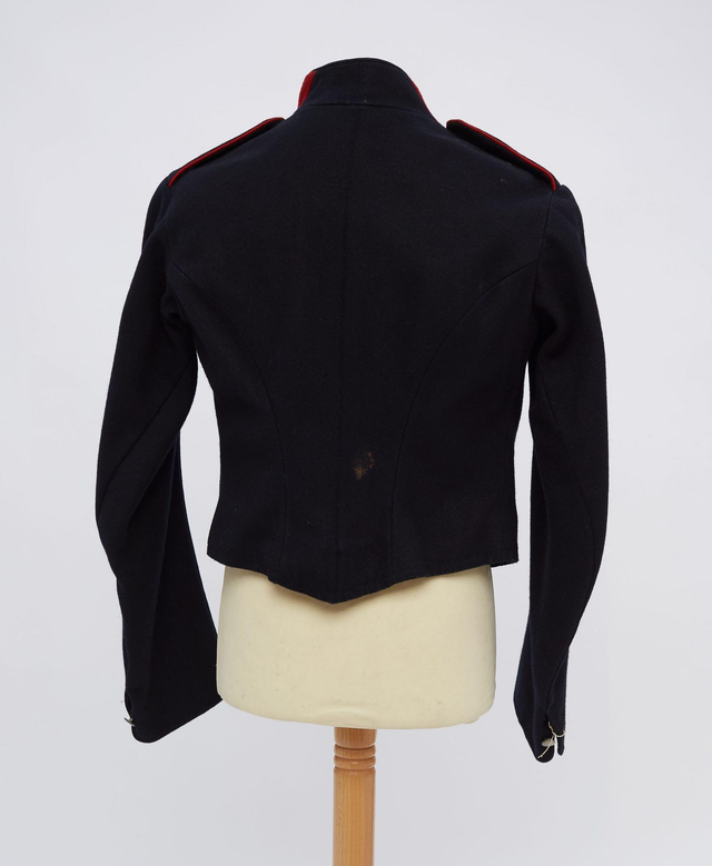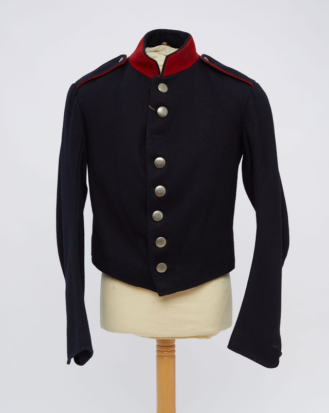Mørkblå uld, 8 knapper, skulderstropper med rød piping, rød krave.