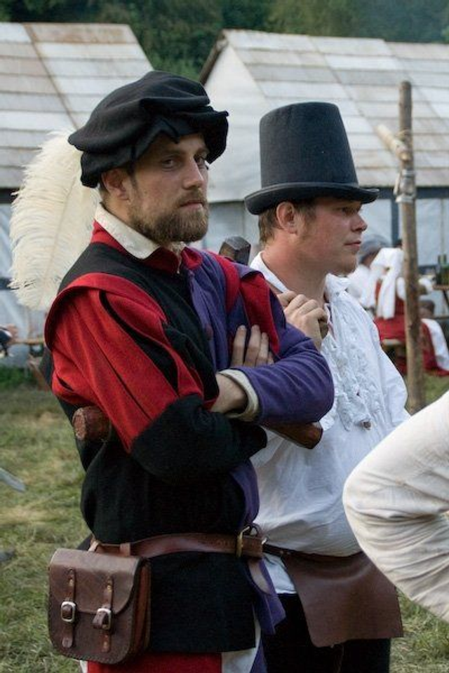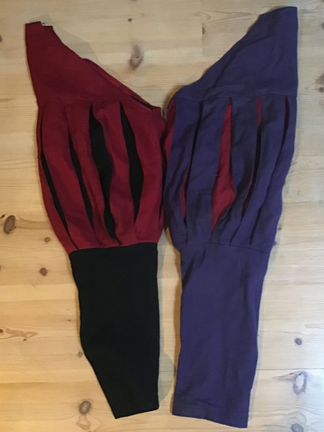 Uniform i uld i sort, rød og lilla. Bestående af jakke og hoser.